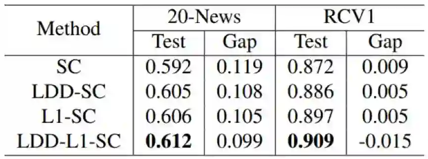 表 2:在 20-News 和 RCV1 的测试集上的分类准确度,以及训练准确度和测试准确度之间的差距