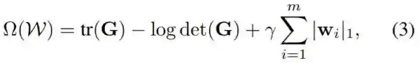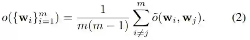这个分数函数不是平滑的,如果被用作正则化器会很难优化。我们则根据提出了一个平滑的函数,并且可以实现与 o(W) 相近的效果。其基本思想是:为了促进重叠较小,我们可以让(1)每个向量有少量非零项,(2)向量之间的支撑集的交集较小。为了实现(1),我们使用一个 L1 正则化器来促使向量变得稀疏。为了实现(2),我们促使向量接近正交状态。对于两个稀疏向量,如果它们接近正交,那么它们的支撑集将会落在不同的位置。这样能让支撑集的交集较小。