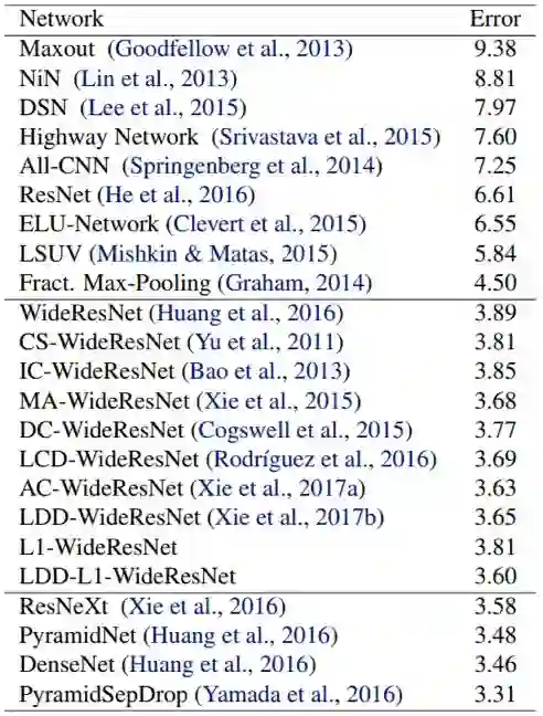 表 5:在 CIFAR-10 测试集上的分类误差(%)