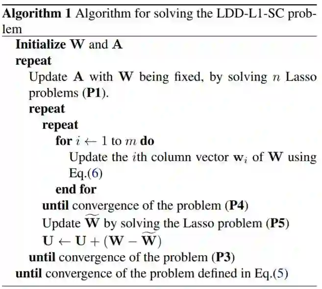 是 LDD-L1 中的 LDD 正则化器;(2)执行 W 的梯度下降更新;(3)将 L1 正则化器的近端算子应用于 W。