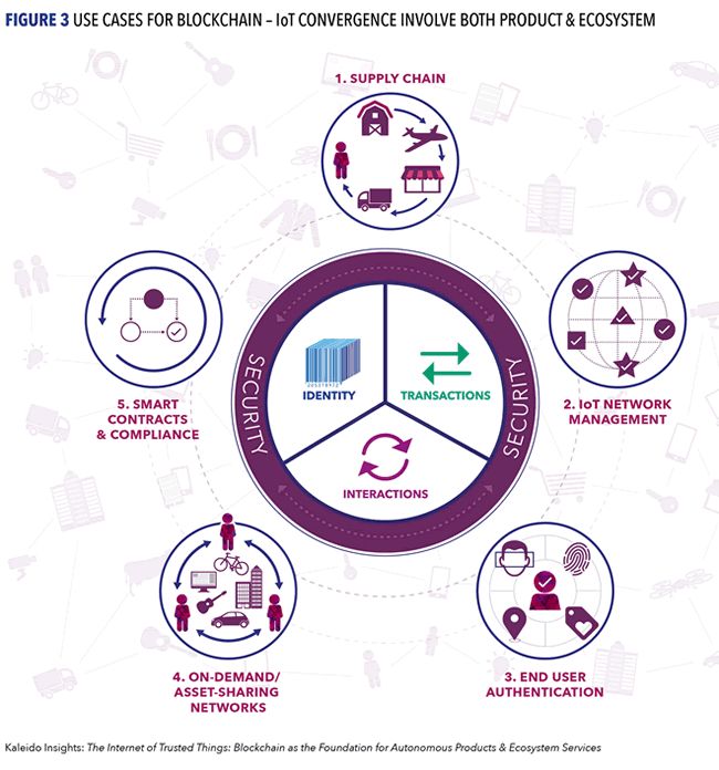 我们的关注重点是可信任的区块链和物联网的各种使用案例。而区块链被称为“新的信任技术”,可以让数字交易环境变得可信。正如Kaleido Insights报告指出,DLT作为IoT的使能者,在产品层面和跨越用例创建信任,提高物联网生态系统各成分的可信任水平。