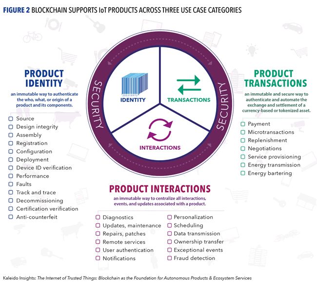 在物联网产品用例上,报告指出了三个主要方面:产品身份(产品及其组件的身份、产品和组件的级别),产品交互(所有交互的集中化、事件和更新、产品的关联性)和产品交易(认证和货币或标记资产的交换和结算的自动化)。