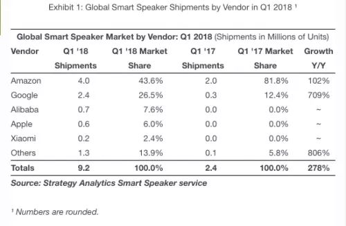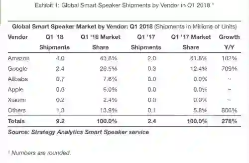 5月18日消息,市场调查公司Strategy Analytics近日公布了2018第一季度全球智能音箱销售数据。数据显示2018年第一季度亚马逊智能音箱出货量占了全球总数的43.6%;而中国互联网企业阿里旗下的智能音箱也有很大增速,目前排在亚马逊和谷歌之后,是第三大出货量的企业;此外,小米也跻身前五名之列,成为了第五大智能音箱出货品牌,位于苹果之后。