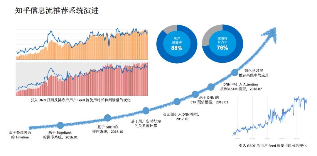在这之后,我们又做了一些优化工作,一个是7月份在DNN做的优化,把注意力机制和LSTM模型引入到DNN的模型里面去,一个是尝试强化学习在推荐系统中的应用。经过这么长时间的优化之后知乎的信息流系统已经在知乎整体业务中占了非常大的体量,用户渗透率(即有多少用户会有效来到首页看内容)达到88%,使用时长占比(包括刷知乎的时长以及在知乎中消费内容的时长等)达到76%。