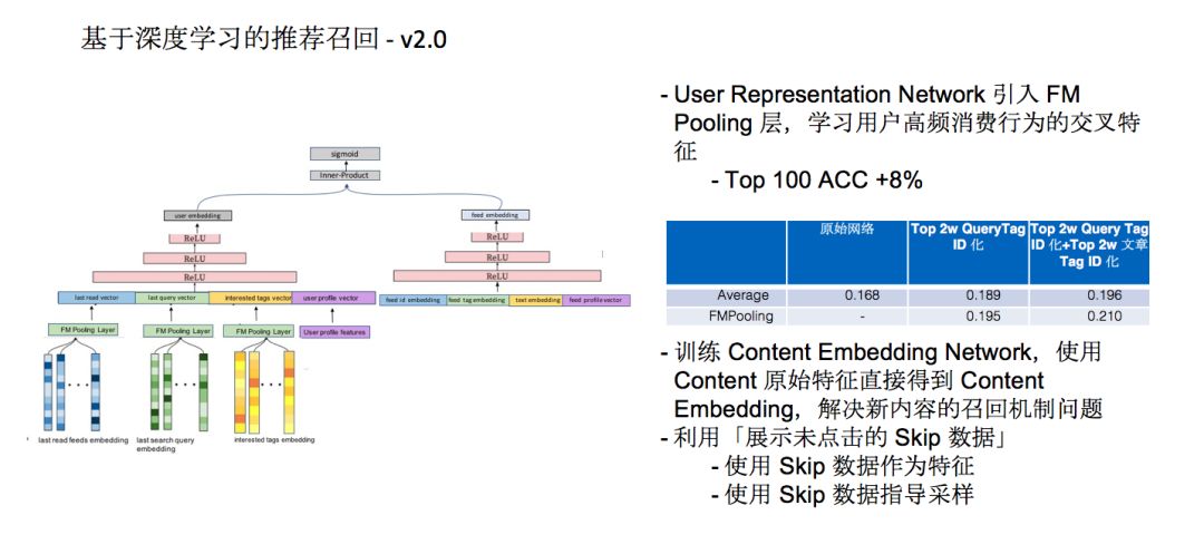 后来我们又对召回框架进行了2.0升级。在1.0版本的召回框架里,“新内容Embedding怎么得到的”这个问题是延迟解决的。用户的表示网络和Embedding召回在效果收益非常明显,协同过滤用户矩阵分解最常用的方法就是ALS,我们拿了一个关键的指标也就是召回从这几万条里挑出的100个结果里准确度有多少,这100个结果里有没有预测到用户下次点击的数据,在这个指标上, DNN 比起ALS来讲提升了10倍的量级,我们希望一个内容产生之后马上算出Embedding放到网络里。