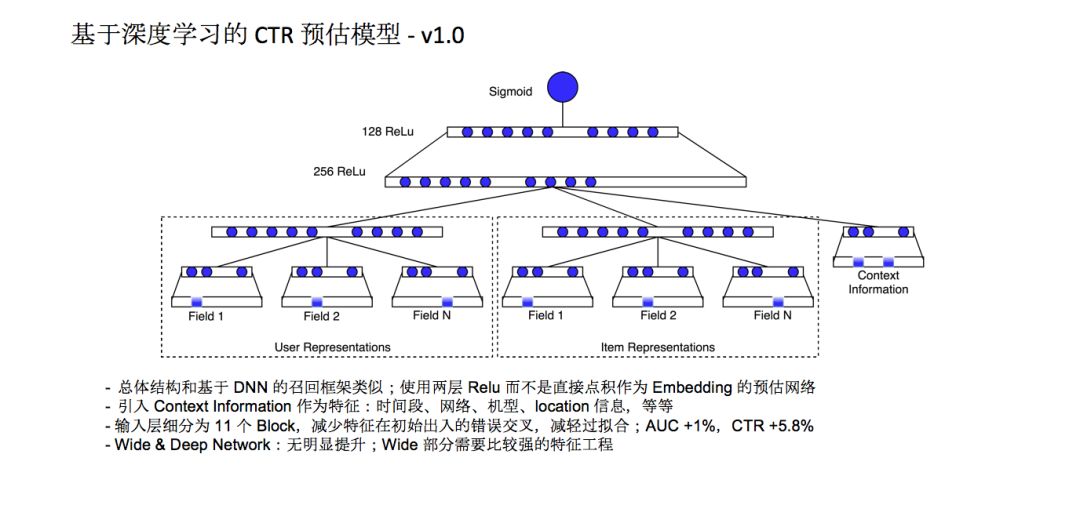 知乎还在排序侧采用了CTR预估的模型。1.0版本总体结构和基于DNN的召回框架类似,使用两层Relu而不是直接点积作为Embedding的预估网络。这个模型上线一段时间之后,我们刚开始没有进行任何的参数裁剪的操作,收效没有达到我们的预期。后来我们做了一个简单的尝试,按照业务的理解把特征组合成不同的Field,这些Field之间先做连接,用户先分成N个Field,比如,Field1是自己填写的资料,Field2是用户兴趣标签,Field3是历史搜索行为,先经过一个简单的子网络再全连接到上层。这个 trick能够有效的减少特征在初始输入时候的错误交叉,会减轻模型的过拟合,线上应用则达到了非常明显的收益,AUC提升了1%,CTR提升了5.8%。