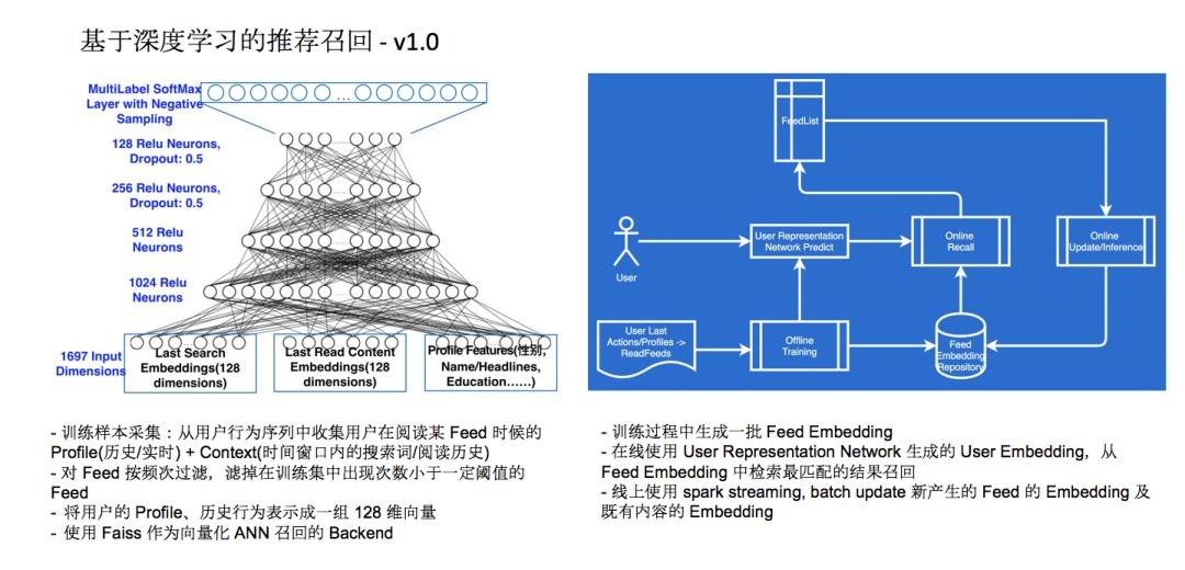 知乎在2017年上线了基于深度学习的推荐召回1.0版本,左边这张图是第一版上线时候的深度学习召回网络框架,整个系统把用户和用户的特征表示成了网络,它和库里几万条内容做了一个多分类,在上层进行SoftMax。整个网络训练下来可以得到两个成果。首先是一个 User Representation Network,它把用户信息表示成128维的网络,我们用了画像里的所有信息,包括他的兴趣标签、各种各样的用户信息,都会放到模型的输入里面去,这个输入经过四层网络之后得到用户128维的 Embedding 表示。与此同时,使用Faiss作为向量化ANN召回的Backend,用ANN召回的方式从这几个条目里选出他最感兴趣的内容推荐给他,这是整个召回框架的工作过程。