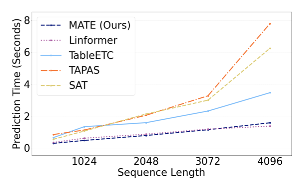 预测速度方面,在作者实验的云上64GB的虚拟机上,当序列长度增长到2048时,MATE比TaPas[7]快了近2倍。