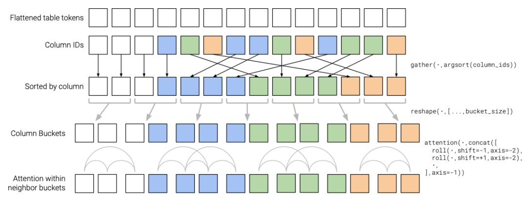 在进一步的注意力模块计算之前,列注意力头会根据token的列编号去排序输入token(对应了图 4中的第2行)。同理,行注意力头会根据token的行编号去排序token。当注意力头重排好输入数据之后,再将长度为 的global section 单独分为一组,计算稠密注意力;将剩下的输入进行分桶,每个桶内token长度相等(对应了图4中的最后一行)为 。每个桶内的token计算自注意力,两个相邻的桶之间也可以进行注意力机制的计算。