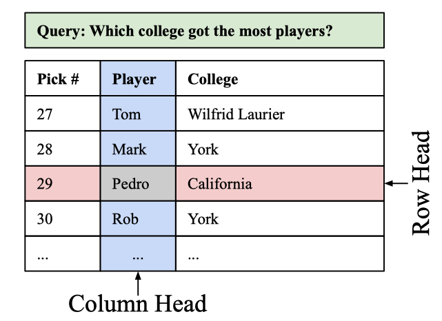 图1. MATE模型的设计动机:MATE模型的稀疏自注意力模型包含两种注意力头(Attention heads):Row Head对齐到(attends to)的tokens所处的单元格都位于一行。同样地,Column Head对齐到(attends to)的tokens所处的单元格都位于自同一列。问题对齐到除此之外的所有其他token。