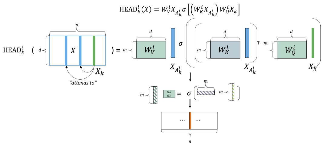 MATE的核心稀疏注意力模块可以用位于图3中第一行的公式概括。其中 是一个 (词向量/隐藏层的维度)行 (序列的长度)列的矩阵,是Transformer层的输入张量;矩阵 , , 是三个映射矩阵,将输入的Query,Key, Values 分别映射到维度 ; 是softmax函数; 是第 个注意力头在 位置的输出向量。