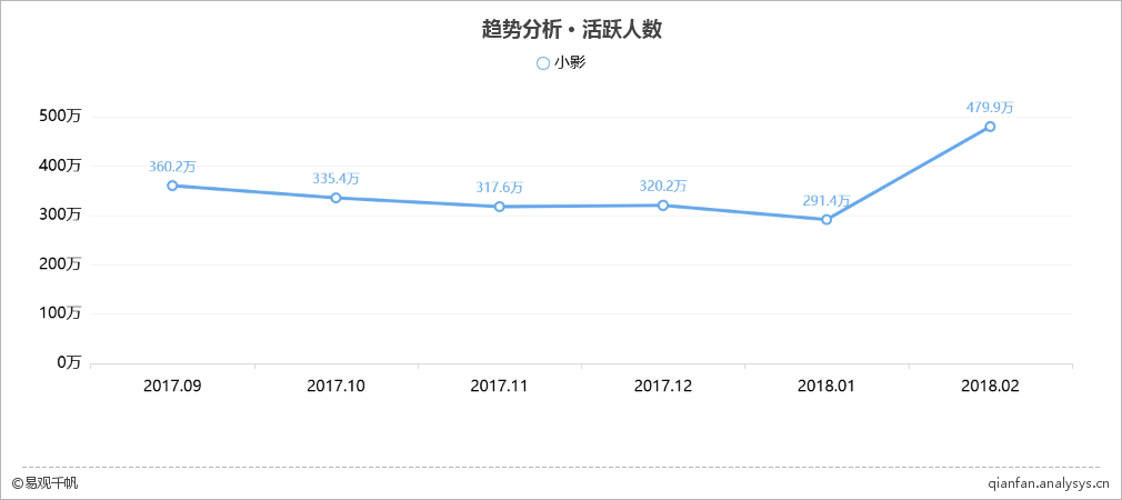 2017年9月-2018年2月短视频综合平台行业活跃用户趋势