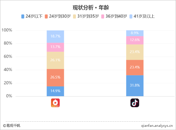 火山小视频和抖音APP同属头条系,与西瓜视频组合成同一短视频产品矩阵,但它们面向的细分市场并不重叠。易观千帆数据显示,火山小视频男性用户居多,用户整体年龄高于抖音APP。