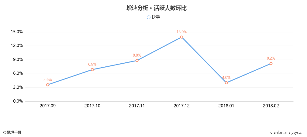 2017年9月-2018年2月快手APP活跃人数增速趋势