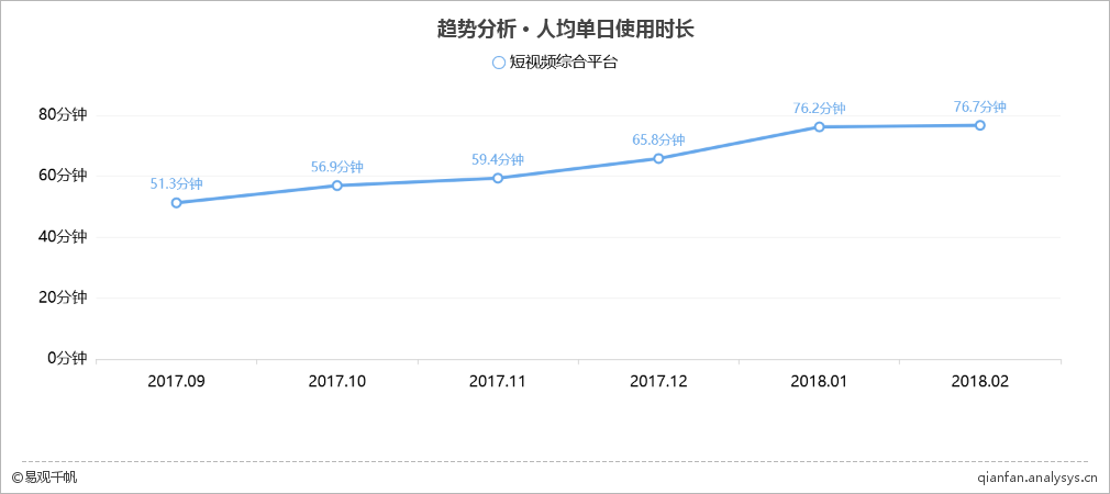 2017年9月-2018年2月短视频综合平台行业人均单日使用时长趋势