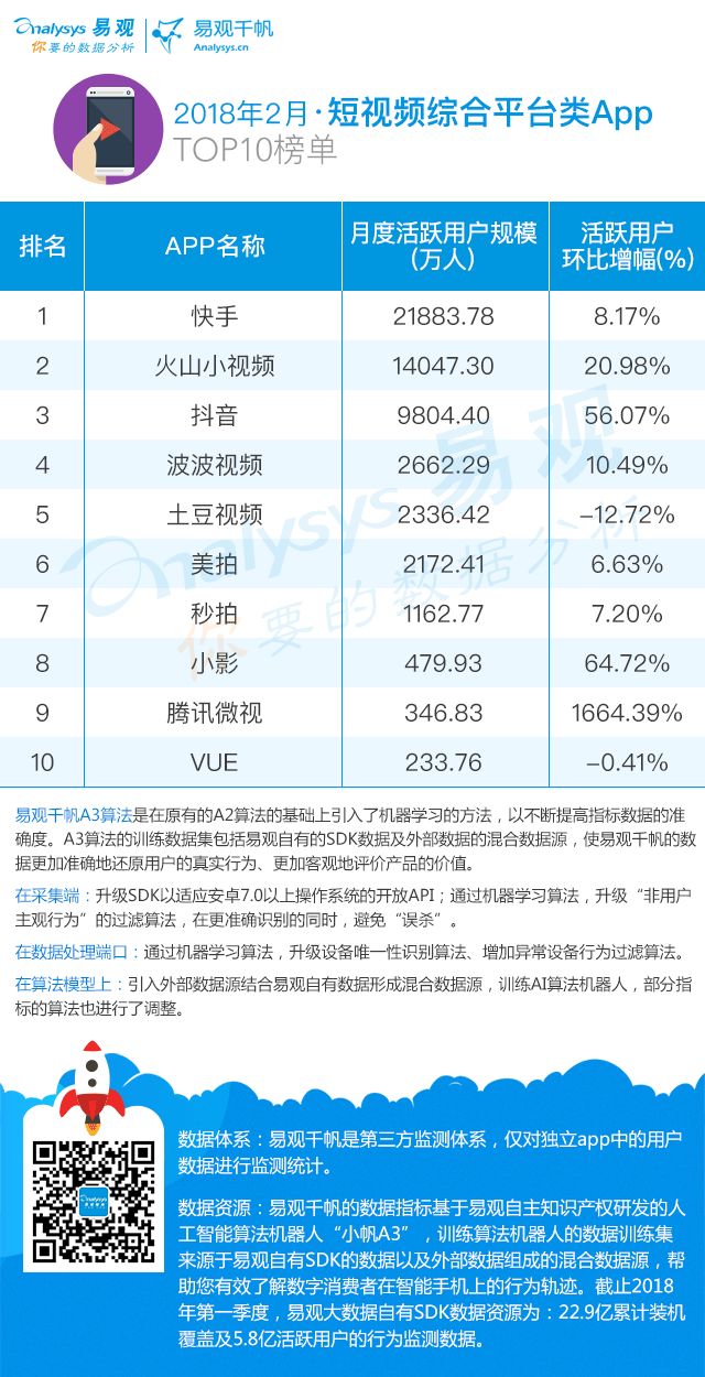 在易观千帆2月短视频综合平台APP榜单中,快手APP以21883.78万活跃用户的绝对优势稳居榜首,火山小视频和抖音APP分别位居第二、三位,行业头部玩家的优势依然显著。此外,腾讯微视卷土重来仅一个月,用户就已增长1664.39%;小影、波波视频等平台的活跃用户增幅较为明显。