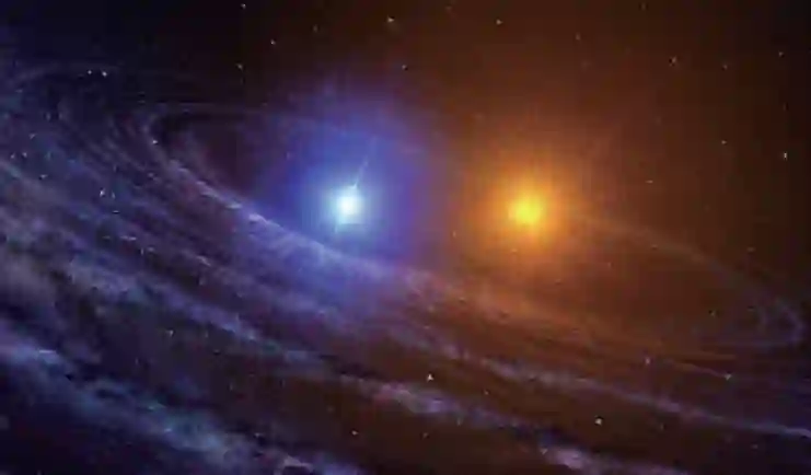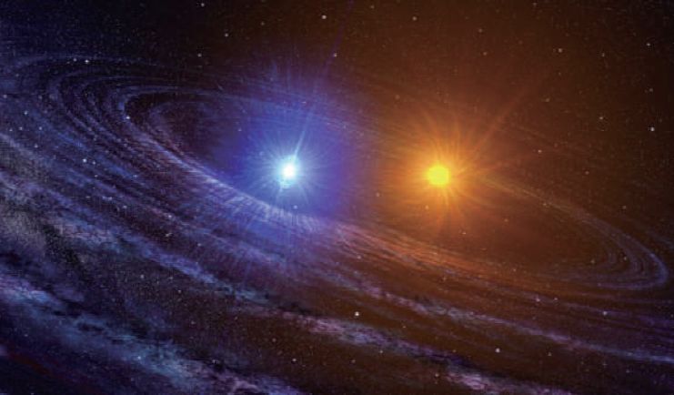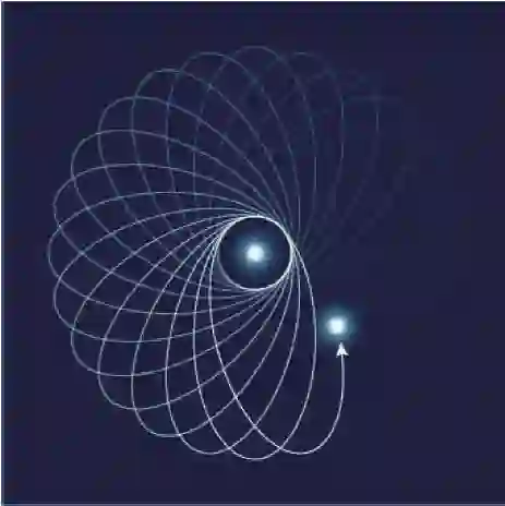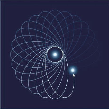 太阳—行星体系是质量严重不对称的两体体系。质量差不多的转动(rotating)双星体系会有更有趣的故事发生(图6)。两个大密度的白矮星会orbit each other,当这两个星体spiral closer together ( 螺旋式靠近)时, 其公转周期(period of revolution)会变短。再靠近一点,还可能有吞噬现象发生。