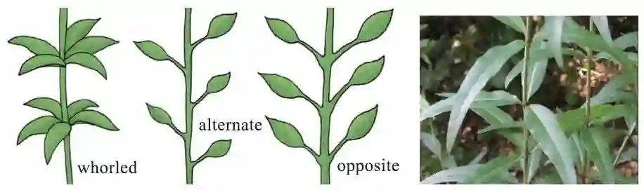 图10 简单叶序,轮生的、互生的与对生的(左图),轮生也有交替的(右)