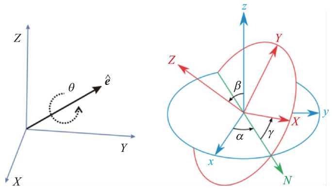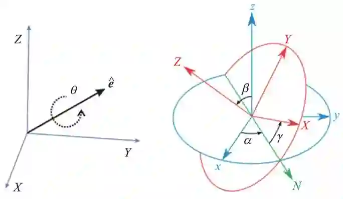 如何表示三维的转动? 有1) 转轴—转角表示法,即确定转动轴取向和绕轴转动的转角;2) Euler angles法。用三个欧拉角表示。一种方式 (φ,θ,ψ) 按照 z-x-z的转动轴序列选取(图5)。当然也可以是(z-x-z, x-y-x, y-z-y, z-y-z, x-z-x,y-x-y)序列中的任一个。另有Tait—Bryan angles, 可以按照(x-y-z,y-z-x,z-x-y,x-z-y,z-y-x,y-x-z) 等序列中的任一个选取;3) 用四元数(quaternion)。具体方法如下:一个单位四元数, 有文献称为versor,有3 自由参数,把矢量x 写成0-标量的四元数, x′= qxq-1 就表示转动(见下)。只从一侧加上四元数乘法也是转动,但是是四维空间的转动。