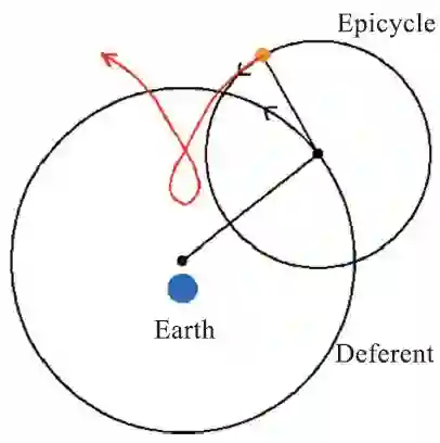 行星绕太阳,或者如从前我们认为的那样绕地球revolve,最简单的轨道是圆才好呢。当然实际情况不是这样,于是人们用epicycle(ἐπίκυκλος, upon the cycle) 的概念来构造轨道, 这套理论叫epicycle-on-deferent theory。Deferent 汉译均轮,epicycle 汉译本轮,基本是不顾原词的胡编乱造。Deferent,来自deferre, to carry down or out,承载,如vas deferens 即是输精管。Deferent 就是那个绕地球的大圆,epicycle 就是骑在deferent 的圆(图9)。如果epicycle and deferent 不能很好地近似行星的轨道, 那就在epicycle 上再骑上一个epicycle。这种圆上骑着圆的运动是非常powerful的数学, 实际上它可以轻松地近似三角形甚至线段。其一发展是无处不在的傅里叶分析,其威力由此可见一斑。