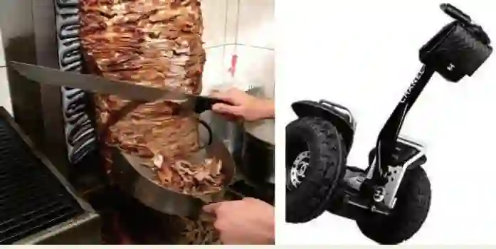 转动,rotate,希腊语的对应动词为γυρίζω (γύρω από)。Γύρω,gyro-,giro-,以各种变体出现在欧洲的各种语言中。欧洲有一道名吃,Greek gyro or gyros (γύρος),希腊式转(盘),也叫Turkish gyro,土耳其式转(盘),德国、意大利等地也用Gyropanne 一词( 字面是转盘),就是旋转烤肉(图11)。Giropode,字面是转动的足,即代步平衡车(图11)。德语管Girokonto 叫转账户头, 干脆简称Giro。意大利语动词girare,名词giro,girata, 就是转弯,见于如下表述如fare un giro inmachina (坐车兜了一圈), fare una giratain barchetta (划船转一圈), girasóle( 绕太阳转,向日葵), essere ingiro ( 流通), esserenel giro ( 是圈内人),mettere in girouna chiacchiera (传播流言),等等。西班牙语的转动是gire, gire a laderecha ( 右转), gire a la izquierda(左转)。Girar obre sí,对应英文的autogyrate,self-rotation,字面意思都是自转、自旋。牛顿的论文Demotu corporum in gyrum,英文一般译为On the motion of bodies in an orbit,其中拉丁语的in gyrum 被译成了in an orbit。Gyro,gyre 这些词在英文中也一样是转动的意思。英文的gyroplane or gyrocopter,是旋翼飞机,gyre 是洋流的涡流。太平洋上曾出现一个trash vortex (垃圾涡旋), 是a gyre of marine debrisparticles,这意思是说那些垃圾碎片因为洋流的涡流而汇聚成了涡旋状的一块。