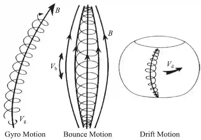 图12 磁场下的gyro motion, 不均匀磁场中的bouncemotion (回弹),以及同时存在电场时的漂移