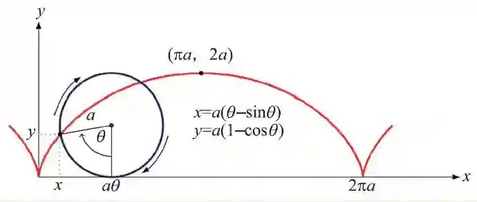 Rotate,来自拉丁语动词rotare,to turn,to roll,to go around。转动是to turn,to roll,基于turn 的衍生词很容易辨认出来。比如tornado(龙卷风),来自tonare,whirling violently(图3)。谈论转动体,别光想着用rotating body,太土,可以说corps tournants。To roll,汉语会译成滚动。一个圆,在平面上无滑动滚动,其上一点划过的曲线是摆轮线 cycloid,其参数方程为 x(θ) =a(θ - sin θ) , y(θ) = a(1 - cos θ) (图4)。Rotate 的衍生词rotating,rotative,rotatory 都是形容词,但其实rotate 本身就是形容词。Rotate 作为及物动词是让别的物体转起来,作为不及物动词是绕着自己的轴转,与spin 同义。Rotation,希腊语是περιστροφή,rotate,希腊语是περιστρέφομαι, 它们的前缀是peri-,around,绕着而且还贴着。Perihelion, around the sun, 近日点,而aphelion,apo+helios,fromthe sun,远日点也。