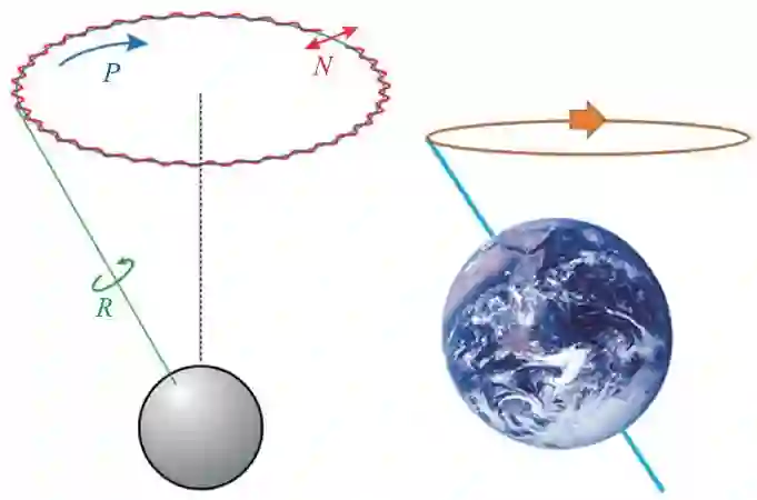 谈论刚体的转动,就必然会遭遇到precession。Precession, 动词形式为preced,precess,来自拉丁语praecedere,字面意思是先行(时间、位置、级别、重要性等方面占先),汉译进动。一个自转的(spinning)物体,比如陀螺,当被施加一个扭矩( 比如来自重力) 改变其转动轴时,一般会引起自转轴在与轴和力矩都垂直的方向上转动(turn),划过一个锥面,此之谓precession。这个turn 的动作就是precede。如果陀螺不是处于自转的状态,扭矩会使其绕水平面内的轴rotate,就倒下啦。地球的转动(rotation),包括intrinsic部分,即自转(rotation,spinning)和precession, 还有nutation ( 章动)。Precession 归于自身重力效应,nutation 归于近处其它物体的引力( 图7)。地球的进动也称为precessional movement, 转一整圈(completing a rotation) 的周期约25700年。Nutation,来自nutare,to nod,点头。不知道为啥被译为章动,取章何义?难道是因为小说“章回”,把这里的回当成retrograde,返回、退行,从而将章字也用于描述天体运行了?