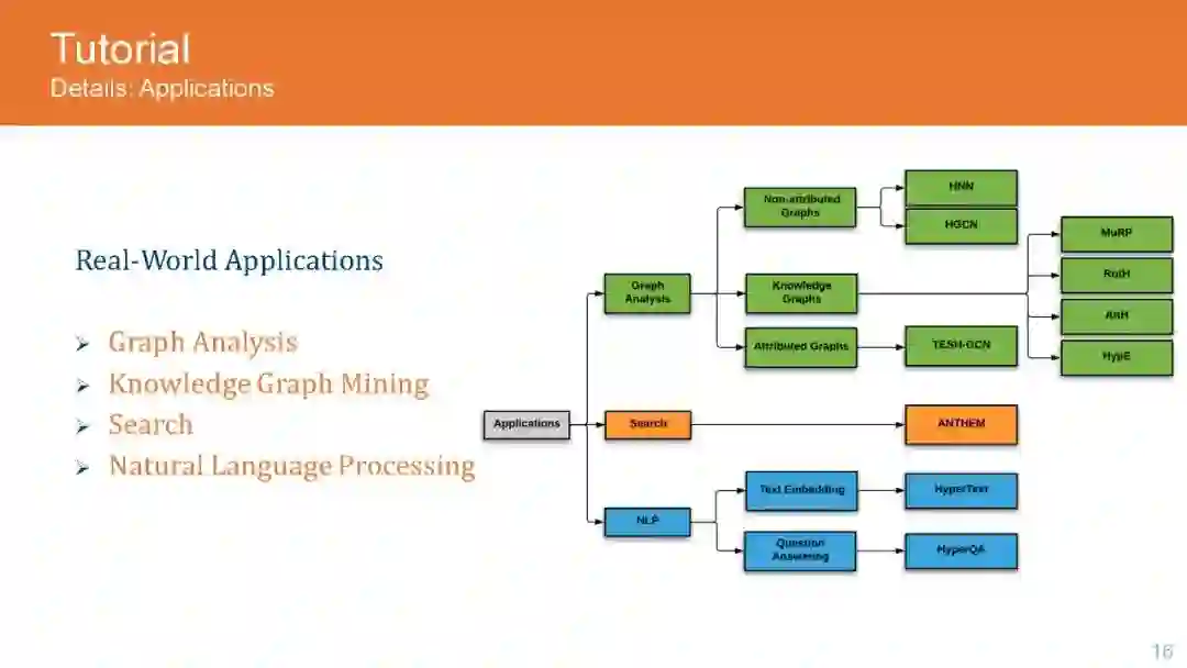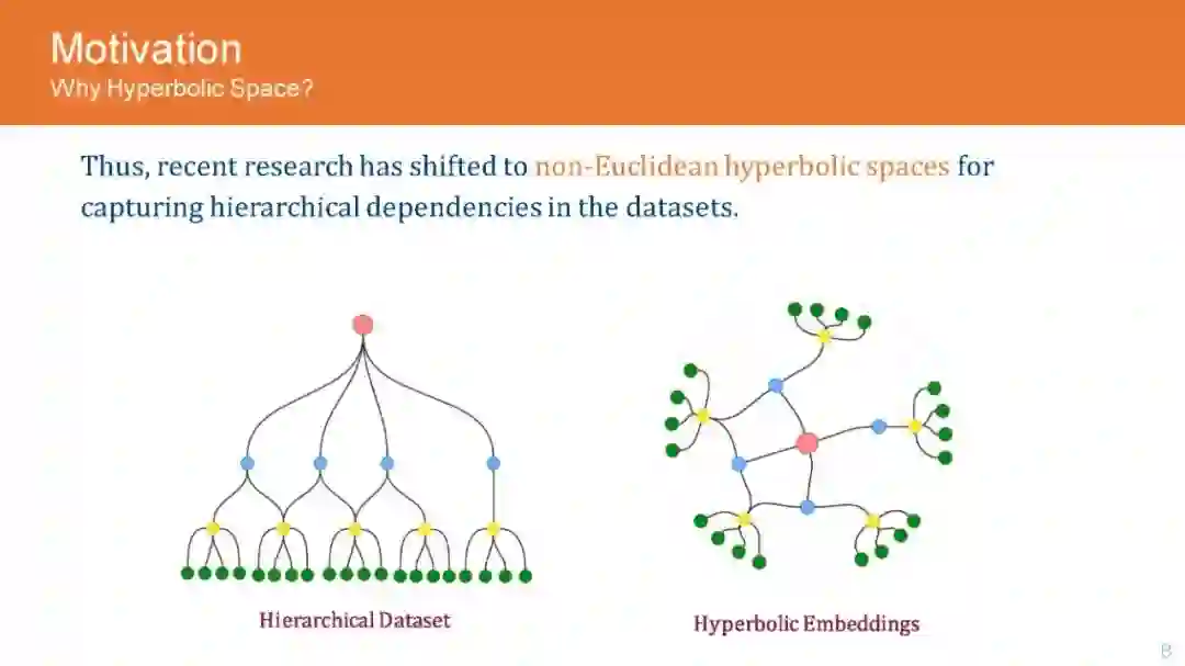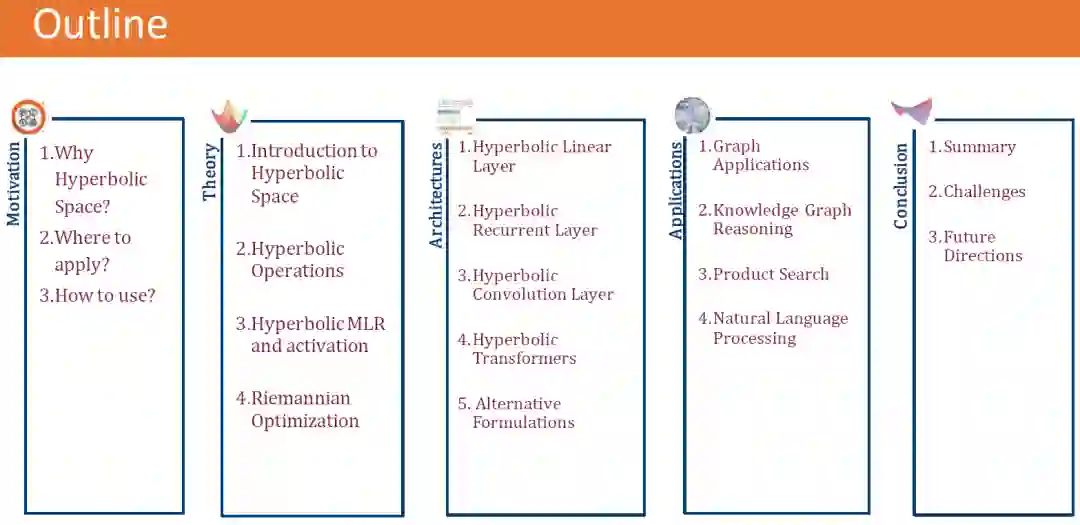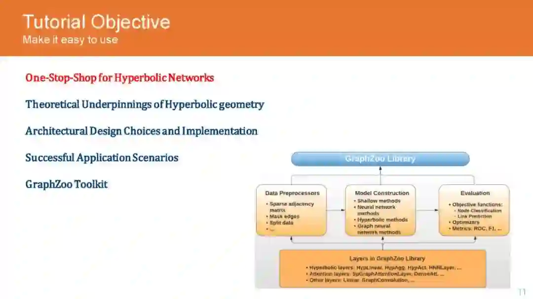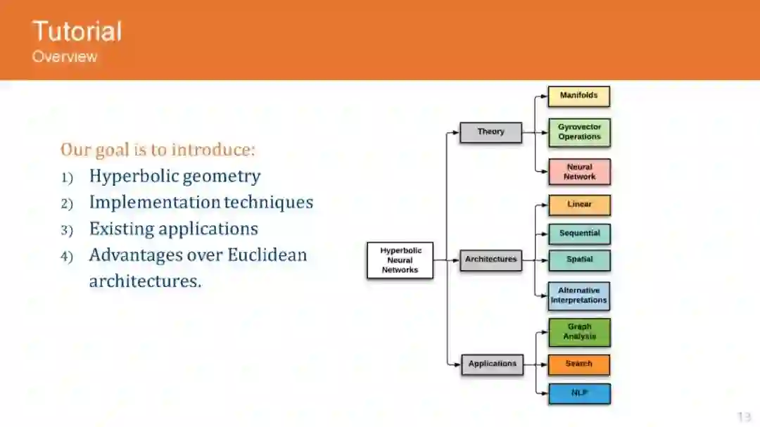 图是普遍存在的数据结构,广泛应用于许多数据存储场景,包括社交网络、推荐系统、知识图谱和电子商务。这导致了GNN架构的兴起,用于分析和编码来自图的信息,以便在下游任务中获得更好的性能。虽然图分析领域的初步研究是由神经结构驱动的,但最近的研究已经揭示了图数据集特有的重要属性,如层次结构和全局结构。这推动了对双曲空间的研究,因为它们能够有效地编码图数据集中存在的固有层次。随后,该研究也被应用到其他领域,如自然语言处理和计算机视觉,取得了令人惊叹的结果。然而,进一步发展的主要挑战是双曲网络的晦涩,以及更好地理解必要的代数操作,以扩大应用到不同的神经网络结构。在本教程中,我们的目标是向网络领域的研究人员和实践者介绍欧几里得运算的双曲等变,这是处理它们在神经网络架构中的应用所必需的。此外,我们描述了GNN架构的流行双曲线变体,如递归网络、卷积网络和注意力网络,并解释了它们的实现,而不是欧几里得网络。此外,我们还通过图分析、知识图谱推理、产品搜索、NLP和计算机视觉等领域的现有应用来激发我们的教程,并将性能提高与欧几里得的同类方法进行比较。