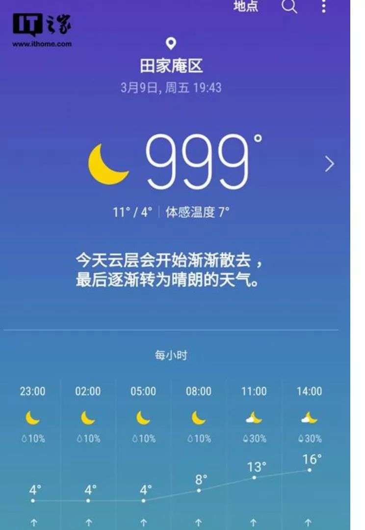 曝部分三星手机“天气”App出现问题:显示气温达到999度