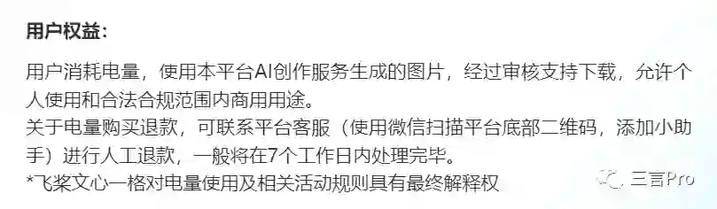 百度文心一格指出,用户消耗电量(电量是一种消耗凭证,可以免费或付费获得),使用平台AI创作生成的图片,经过审核支持下载,允许个人使用和合法合规范围内商用用途。