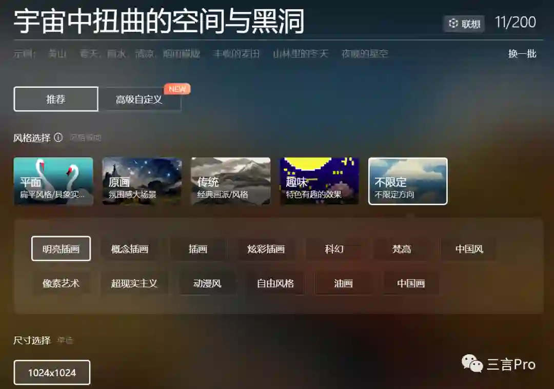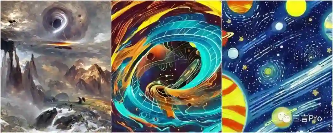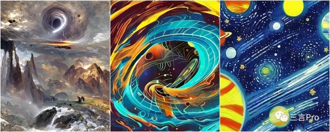 笔者用关键词“宇宙中扭曲的空间与黑洞”试了一组,风格分别为原画概念插画、传统中国风、趣味梵高。