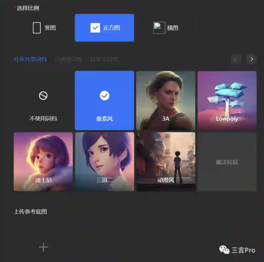 另外一家国内平台也有较为丰富的风格选择,另外还可以选择参考底图。