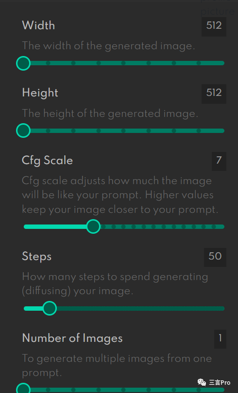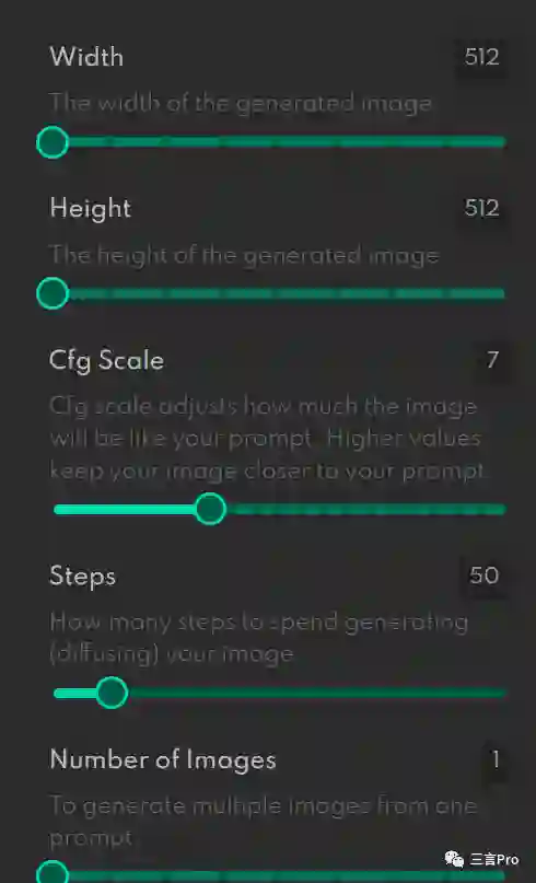 笔者测试的这两个国外平台在可定制化方面只有最基础的设置,一般是图像的宽度、高度、匹配精度和生成图像的步数。