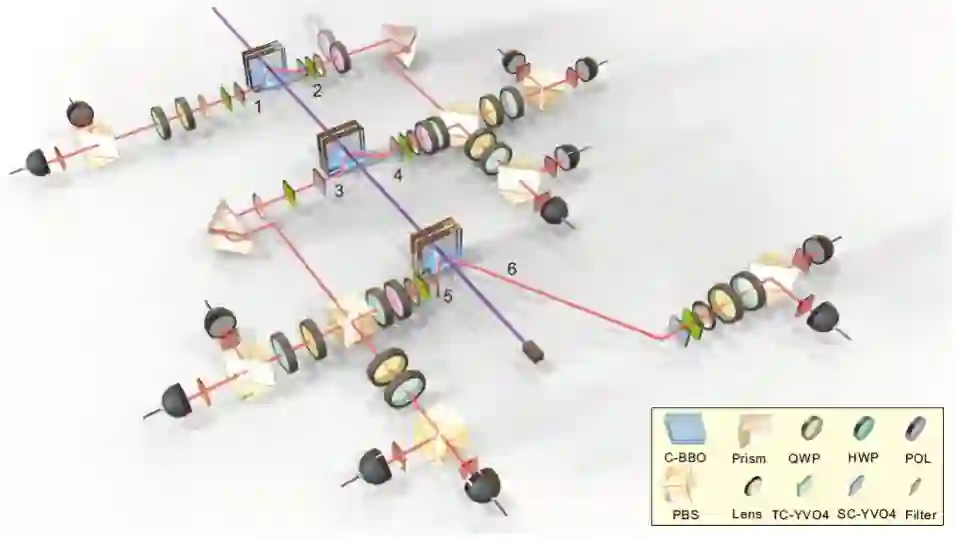 图 3:实验装置。中心波长为 394nm 的紫外激光脉冲(脉冲持续时间为 150 飞秒,脉冲重复频率为 80MHz)通过三个偏硼酸钡(BBO)晶体 [42] 以生成三对纠缠光子对 (|H>|V>+|V>|H>)/√2(空间模式分别为 1-2、3-4、5-6,细节参见附录 1)。光子 2(3)和 4(5)在 PBS 上进行干涉。所有的光子使用 3-nm 带宽的过滤器进行光谱过滤。C-BBO:三明治形态的 BBO+HWP+BBO 组合;QWP:四分之一玻片;POL:起偏器;SC-YVO4:用于空间补偿的 YVO4 晶体;TC-YVO4:用于时间补偿的 YVO4 晶体。