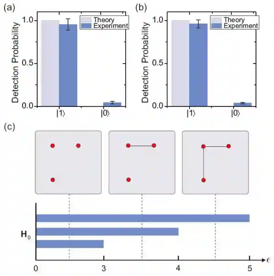 图 4:最终的实验结果。最终的输出通过在泡利-Z 基上测量本征值寄存器确定。两个不同 1-单纯形的态输入的测量期望值(蓝色条形)和理论预测值(灰色条形)如(a)和(b)所示。误差线表示 1 个标准偏差,它是根据原始数据,通过泊松分布推导得出的(c)0<ϵ<5 的条形码。由于不存在 k≥1 的 k 维洞,这里只给出了第 0 个贝蒂数。当 0<ϵ<3 时,所有点之间都没有连接,因此第 0 个贝蒂数等于数据点个数,即 0<ϵ<3 时有三个条形。当 3<ϵ1<4 和 4<ϵ2<5 时,第 0 个贝蒂数分别等于 2 和 1。