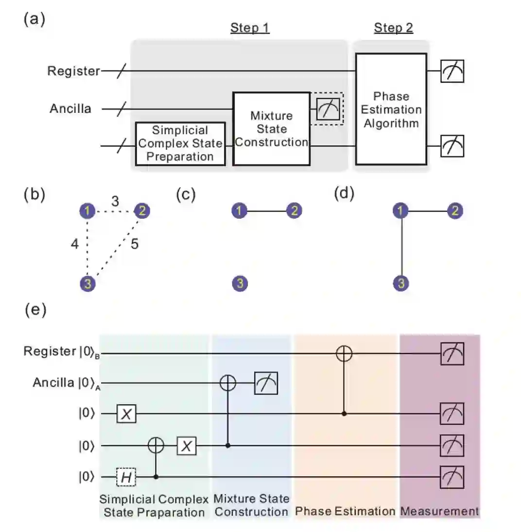 第一个数据点分别和第二个和第三个数据点连接。(e)5 量子比特的优化量子线路。不同颜色的模块代表 4 个基本阶段(单纯复形制备、构造混态、相位估计、测量)。