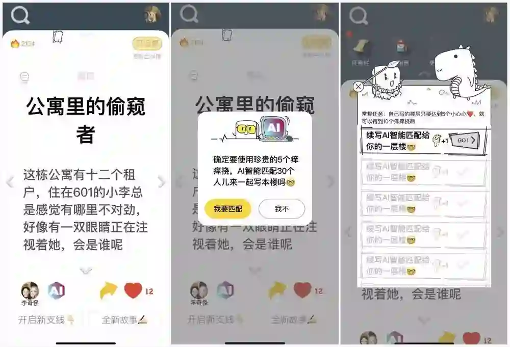 用户积累的 “痒痒挠”还可以用于进一步消费甚至“投资”。通过消费“痒痒挠”,用户能获取修改、调整其他用户故事的权限;增加内容的曝光度,利用AI智能匹配系统帮自己匹配30个用户一起写故事,以获得更多的“痒痒挠”。这样一来,货币体系就会运转起来,形成闭环。