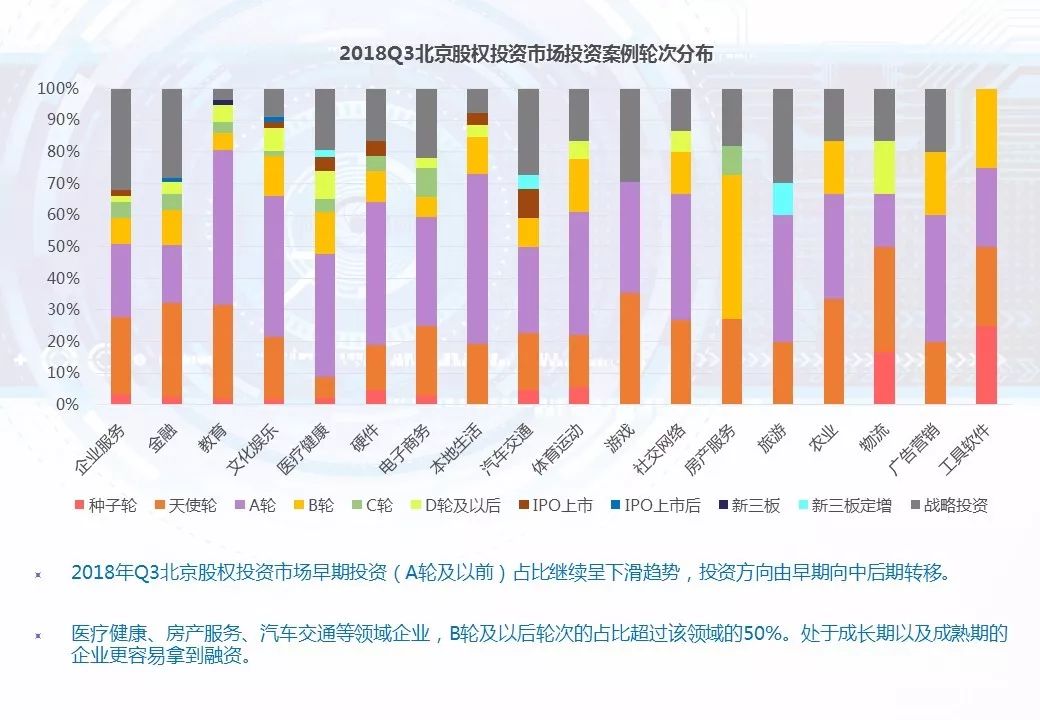 企业服务、金融、教育成为 2018 年 Q3 北京股权投资市场最热门三大赛道。其中,企业服务再次拔得头筹,投资热度依旧不减。而硬件行业吸金能力最强。