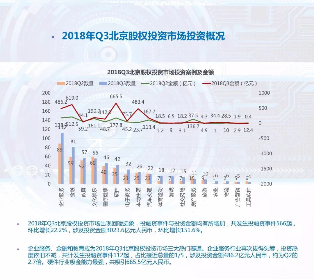 2018 年 Q3 北京股权投资市场出现回暖迹象,投融资事件与投资金额均有所增加。投融资事件 566 起,环比上升 22%,涉及投资金额 3023.6 亿元人民币,环比上升 151.6%。