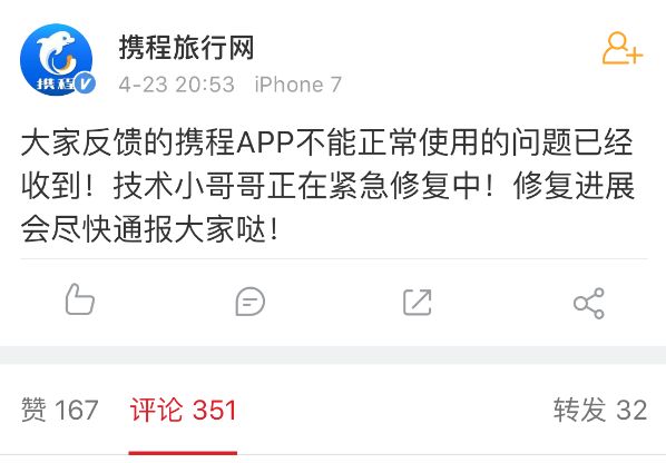 对此,携程方面回应称,大家反馈的携程APP不能正常使用的问题已经收到!技术小哥哥正在紧急修复中!修复进展会尽快通报大家哒!