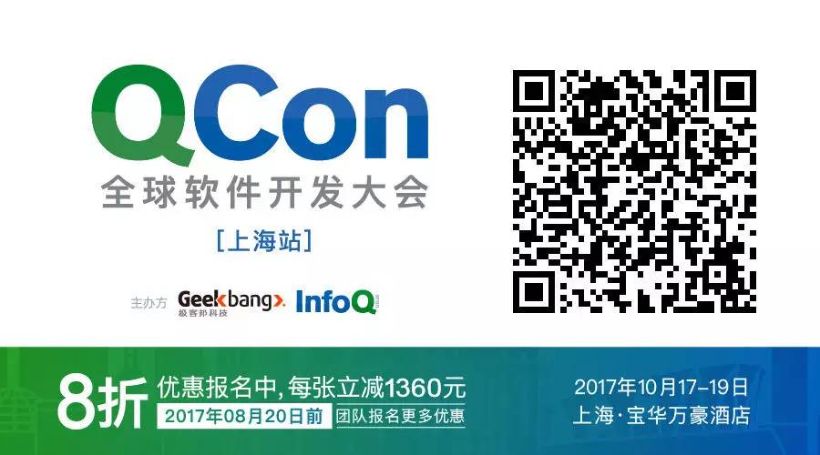 更多关于精彩技术专题请关注QCon 全球软件开发大会,QCon 上海站目前 8 折优惠报名中,2017 年 08 月 20 日前,立减 1360 元,团购报名更多优惠~点击【阅读原文】跟技术大咖零距离。欲购票或咨询问题可联系购票经理 Hanna ,电话/微信:15110019061。