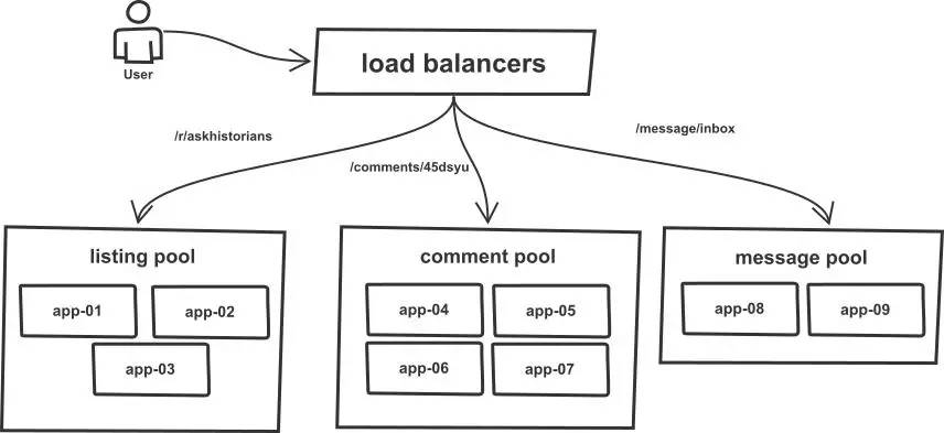 他们使用了负载均衡器,对请求进行分类,把流量分配给不同类型的服务器群。分流带来的好处显而易见,一方面可以轻松应对流量高峰,一方面避免不同服务器群之间的互相影响。