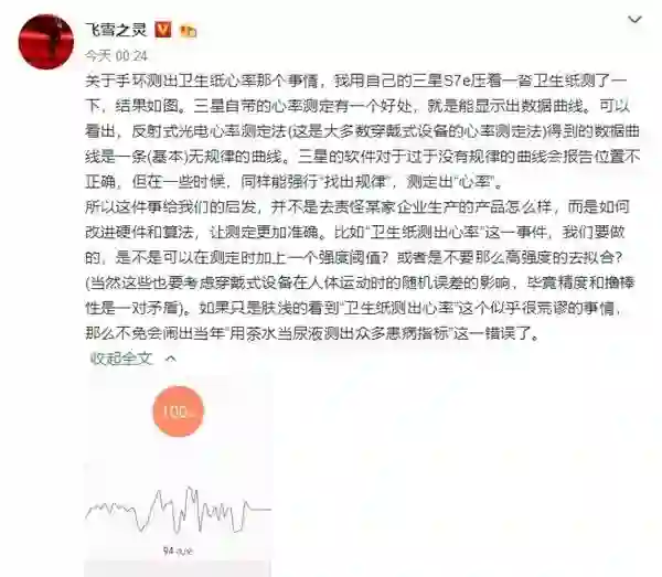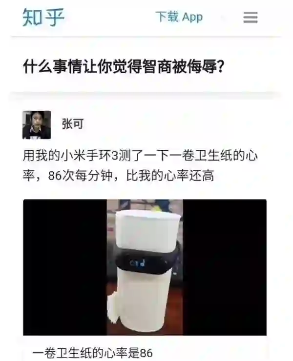 如今智能手环已经成为很多小伙伴经常佩戴的随身物品,既能监控运动和睡眠,又能测心率,掌握健康状况,可谓一举两得。不过最近知乎上的一篇回答将智能手环送上了热门话题,回答中提到答主用自己的小米手环测了一下卫生纸的心率,居然得出了心率是 86。