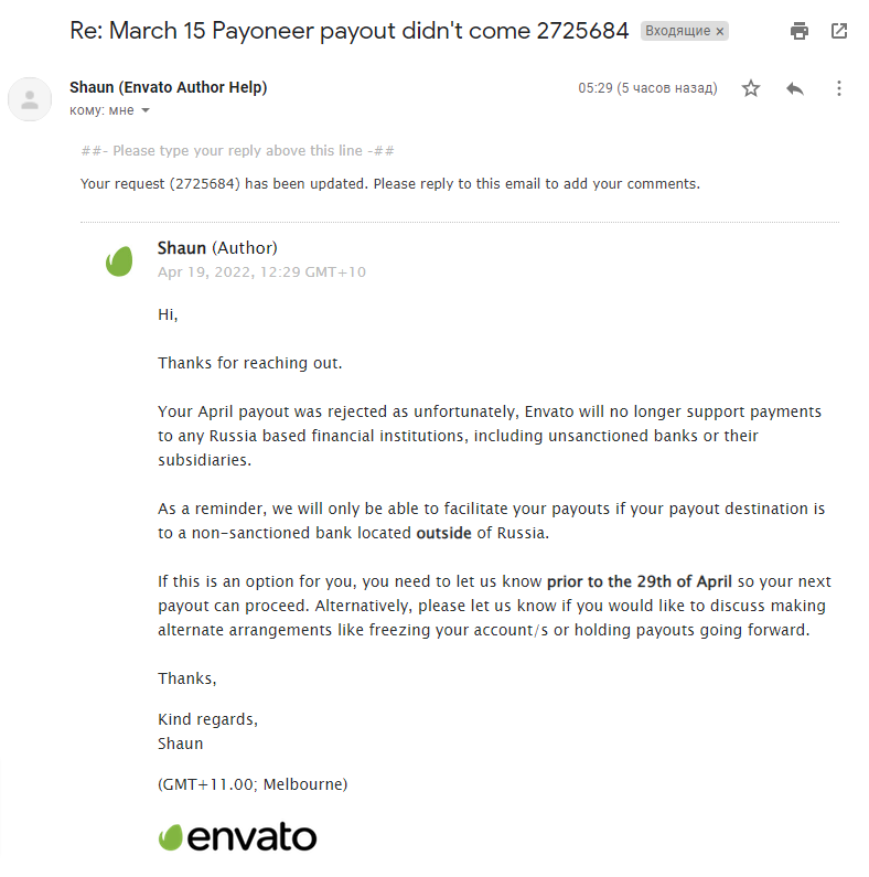 据 Mansur 所提供的 Envato 方面给他的回复,Envato 目前“不再支持向任何俄罗斯金融机构付款,包括未经批准的银行及其子公司”,只有当作者的“支付目的地是俄罗斯以外的非授权银行”时,Envato 平台才予以提现。