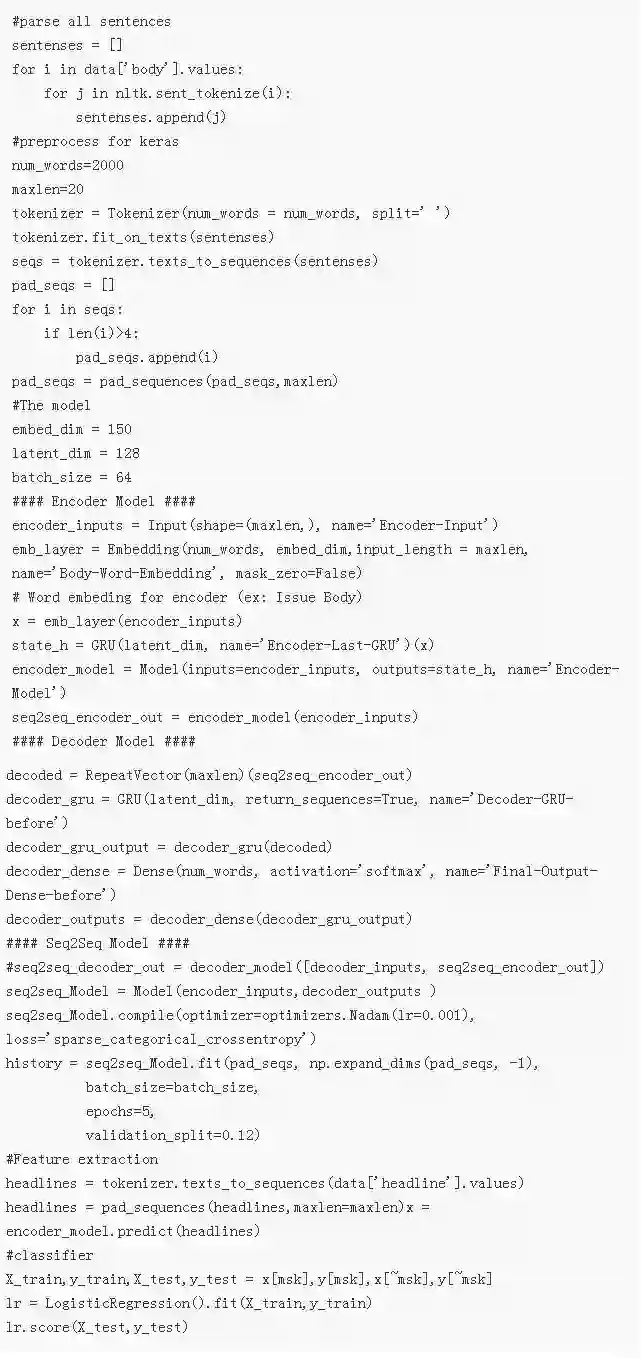 我们的自编码器是一个简单的序列到序列结构,由一个输入层、一个嵌入层、一个 LSTM 层,以及一个 softmax 层组成。整个结构的输入和输出都是标题,我们将使用 LSTM 的输出来表征标题。在得到自编码器的表征之后,我们将使用 logistics 回归来预测类别。为了得到更多的数据,我们会使用文章中所有句子来训练自编码器,而不是仅仅使用文章标题。