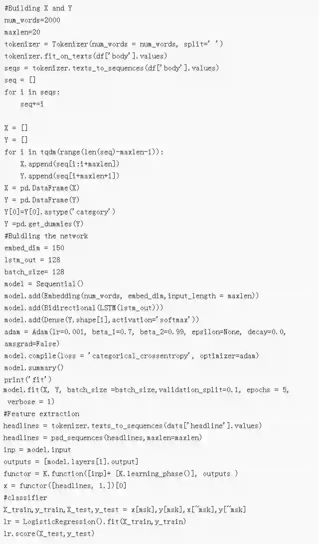 我们的架构和自编码器的架构是类似的,但是我们只预测一个单词,而不是一个单词序列。输入将包含由新闻文章中的 20 个单词组成的窗口,标签是第 21 个单词。在训练完语言模型之后,我们将从 LSTM 的输出隐藏状态中得到标题表征,然后运行 logistics 回归模型来预测类别。