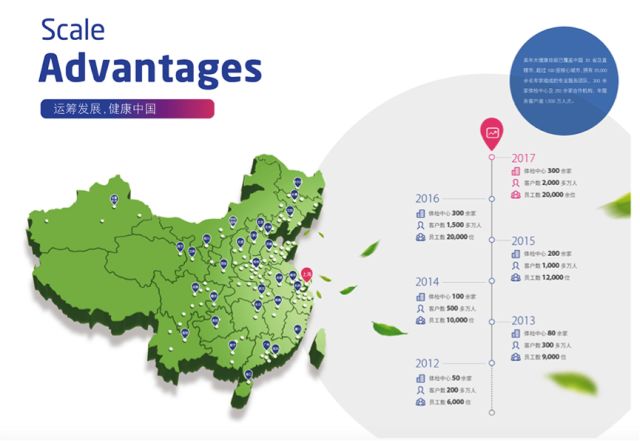 在云栖大会现场,驻云CloudCare的大健康明星客户——美年大健康(代码:SZ002044)就分享了自己基于云计算的智慧实践与蜕变经验。这家同样以上海为总部的企业,是中国最大的健康大数据平台和健康需求入口,也是国内市值最高的医疗服务机构。2017年,美年大健康在200多个核心城市布局400余家体检中心,年服务人次超过2000万,预计3年后这一数字将刷新至1亿。