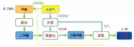 DMTE的技术路线如上图所示,主要通过甲醇脱水制二甲醚,二甲醚与一氧化碳发生化学反应生成乙酸甲酯,乙酸甲酯与氢气发生化学反应生成乙醇产品。值得一提的是,二甲醚与一氧化碳反应生成乙酸甲酯是该技术全球领先的核心所在。