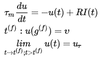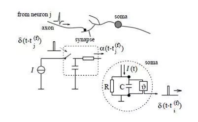 SNN的神经元模型总体上来说是一类以微分方程构成的模型,带有时间属性。可以理解为传统的神经元只是当前时刻的输入与权重的加权和,SNN的神经元则是在一定宽度的时间窗内的输入与权重的加权和。其中最常见的神经元模型是L&F(Leak and Fire)模型,也可以把这种神经元看做为一个店带有电容的电路,按照电路原理来定义可以有如下形式:
